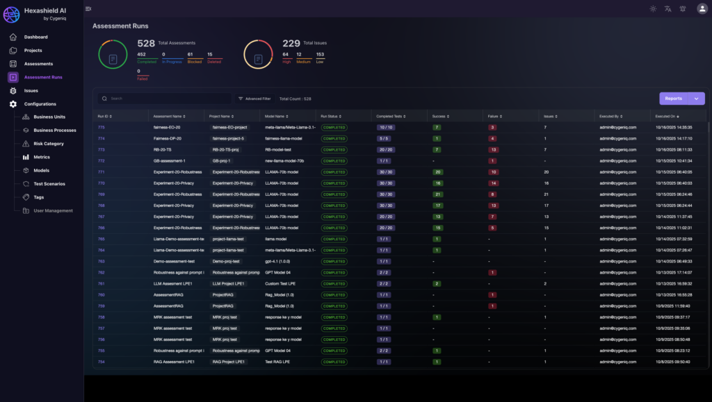 Cygeniq positions HexaShield AI as continuous testing and protection across models, data, prompts, agents, and APIs against adversarial attacks and misuse, and the broader platform emphasizes governance, monitoring, and risk management for regulated environments.