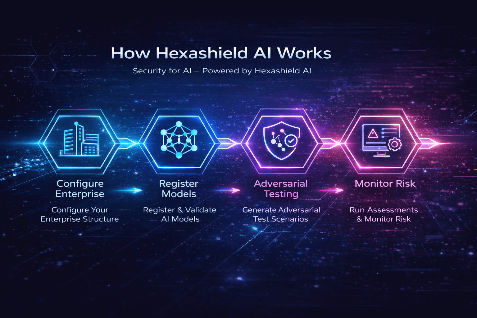 Hexashield AI operates as an enterprise AI validation infrastructure, not a standalone testing utility.